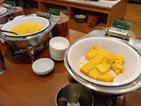 では朝食へ。宿泊客が少なかったので7時30分〜9時までの一部制。ビュッフェ台のお料理。厚焼き玉子 スクランブルエッグ高濃度硫黄泉で茹で上げた温泉···