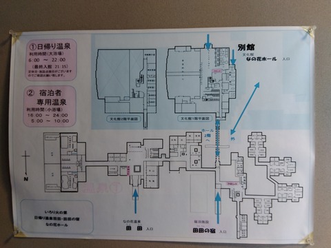 日帰り温泉施設の大浴場「なの花温泉田田」には3回入浴しました。宿泊棟から日帰り入浴施設へ続く通路。ここでスリッパを脱いで、素足で大浴場へ向か···